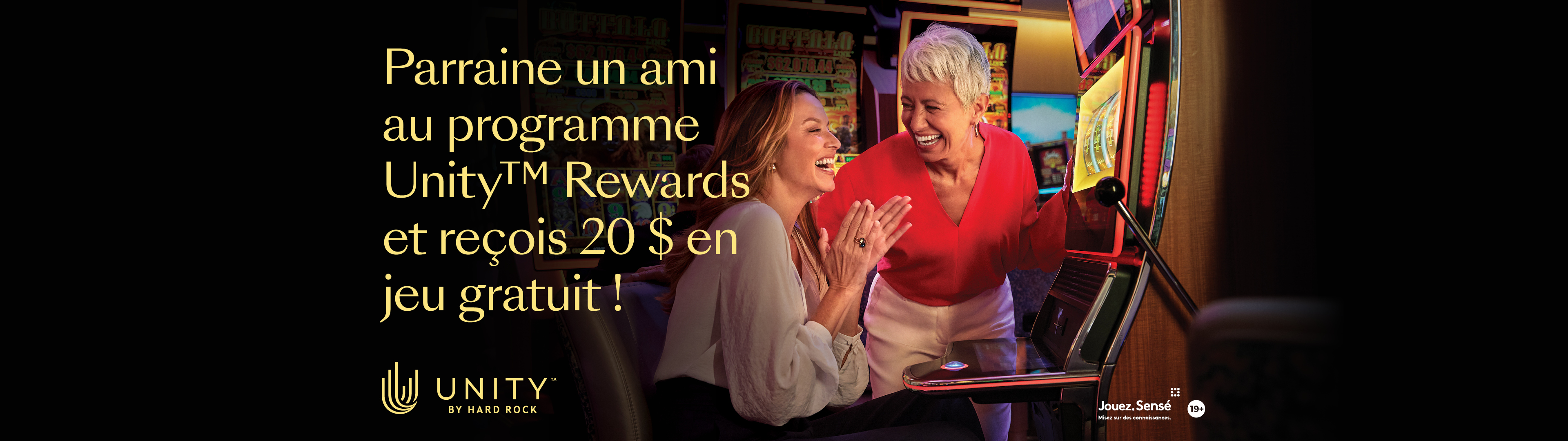 Nous voulons doubler le plaisir avec Bring a buddy ! Tout au long du mois, les membres Unity by Hard Rock qui invitent un ami à s'inscrire recevront 20 $ de jeu gratuit ! De plus, les nouveaux membres recevront également jusqu'à 25 $ en jeu gratuit !