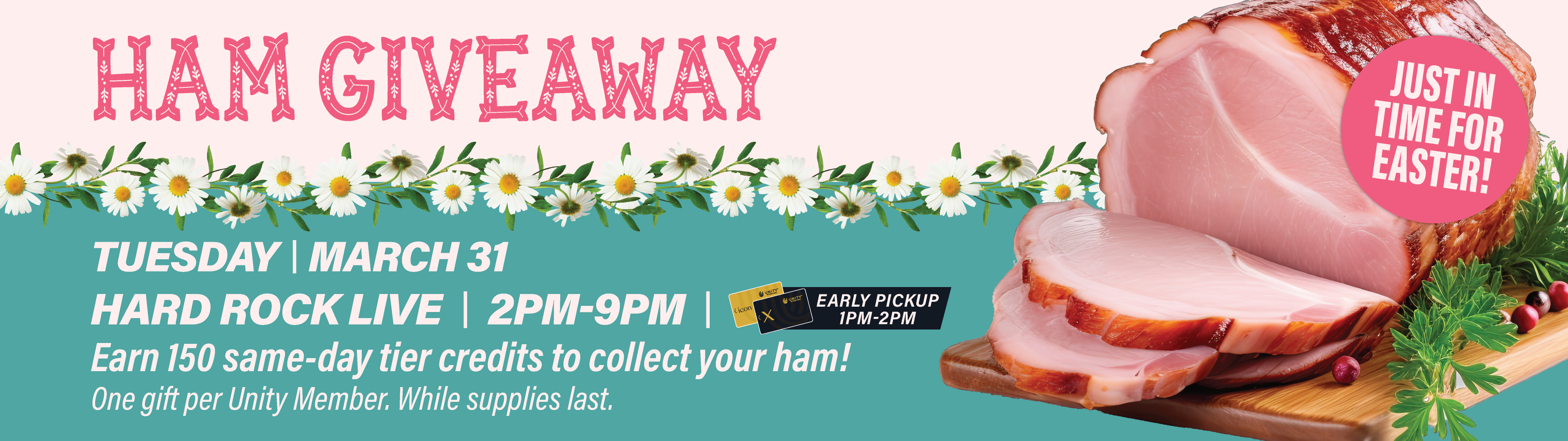EARLY PICKUP 12PM-1PM. EARN 150 SAME-DAY TIER CREDITS TO COLLECT YOUR HAM! ONE GIFY PER UNITY MEMBER. WHILE SUPPLIES LAST.