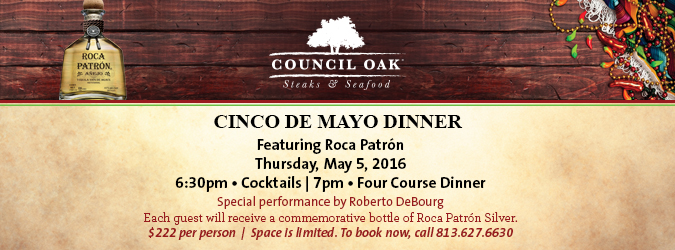 TAMPA, Fla. (April 18, 2016) – Council Oak Lounge in Seminole Hard Rock Hotel & Casino Tampa will host a Cinco de Mayo Patrón pairing dinner on Thursday, May 5.